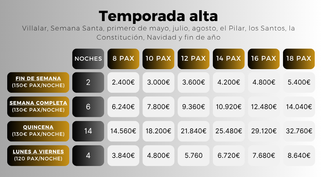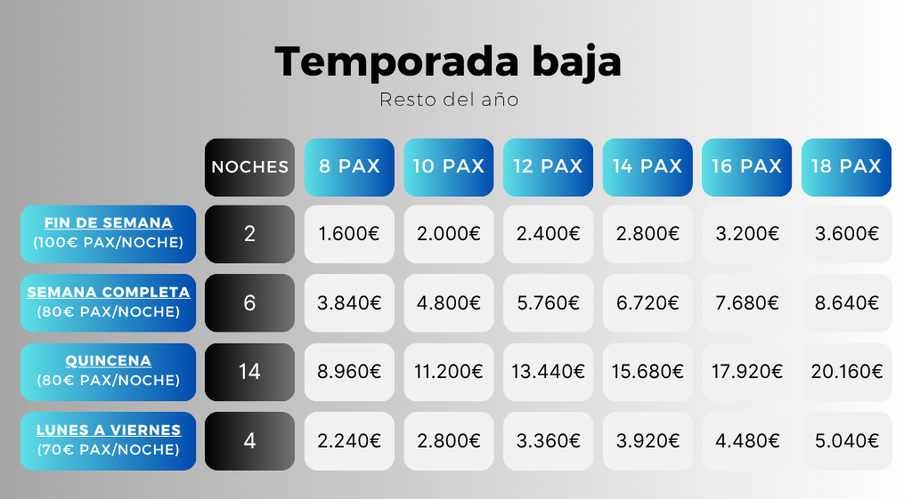 Regalamos el alojamiento siempre de una persona si sois impares. Es decir, si venís un grupo de 11, pagaréis como 10. Un grupo de 13 pagará como 12, un grupo de 15 pagará como 14 y un grupo de 17 pagará como 16.